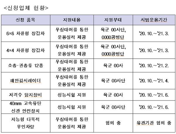이에 국방부와 방위사업청은 각 군 및 관계기관과의 협의를 통해 2019년 11월에 군 시범운용 제도를 도입하였고, 2020년 4월부터 신청을 접수하여 현재 6륜 구동 장갑차, 4륜 구동 장갑차, 총기류 등이 우리 군에서 시범적으로 운용되고 있다.