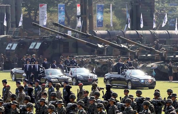 기념식 행사는 간소했지만, 괴물 미사일 ‘현무-5’ 등 핵·미사일 위협에 대응하는 ‘3축 체계’ 전력과 함께 K-방산의 대표 전력인 K-9 자주포, K-2 전차, 차륜형장갑차 ‘백호’ 등도 전시됐다.