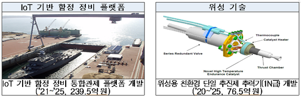 정비창의 스마트화를 위한 ‘IoT 기반 함정 정비 통합관제 플랫폼 개발’ 사업이 대표적인 다부처 연계 핵심기술 협력사업이며, 인공위성 핵심부품의 선진화·친환경화를 위한 ‘위성용 친환경 단일 추진제 추력기(1N급)’ 개발도 군과 함께 지속 추진할 예정이다.