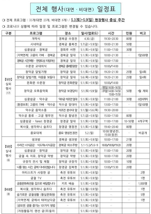 더불어 덕수궁과 경복궁에서만 선보였던 수문장 교대의식을 새롭게 추가 기획한 ’창덕궁 돈화문 수문장 교대의식‘ 등 다양한 대면 행사가 진행된다.
