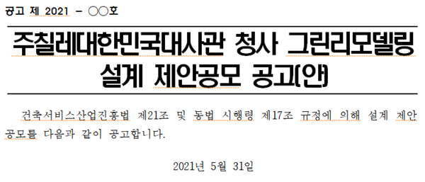 외교부는 사업목적으로 “현 주칠레대사관 청사는 건물의 노후화로 인해 청사의 기능성이 저하되고 있어 친환경 고효율의 그린 및 노후공관 리모델링을 통해 국가 위상에 맞는 외교활동 기반을 조성하고 재외공관의 안전성을 확보코자 함” 이라고 밝히고, 사업개요와 설계공모일정을 공개했다.