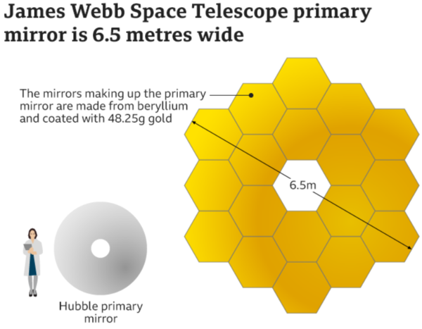 제임스 웹 우주망원경에 탑재된 거울은 주경 지름이 약 6.5m에 달한다. 망원경이 지구에서 발사될 때는 아리안 5호 크기에 맞게 접혀 있다가, 우주로 날아간 이후 거울을 다시 펴게 된다.