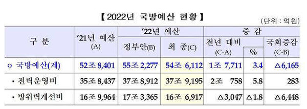 내년도 국방예산은 총액은 당초 정부안 55조2276억원보다 6165억원 줄었으나, 2021년 전체 예산 52조8401억원 대비 약 3.4%, 1조7711억원 늘어난 것이다.