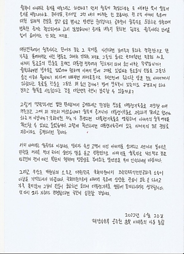 그는 이어 “당사자 육성 고백이 아닌 아버지를 살해하고 시신까지 불태운 만행을 저지른 적대 국가(북한)의 살인자 말을 듣고 정황만으로 아버지를 월북자로 낙인 찍은 것은 자국민의 편이 아닌 북한의 행위에 정당성을 부여하는 발언”이라며 “저희 아버지는 월북자가 아닙니다”라고 절규했다.