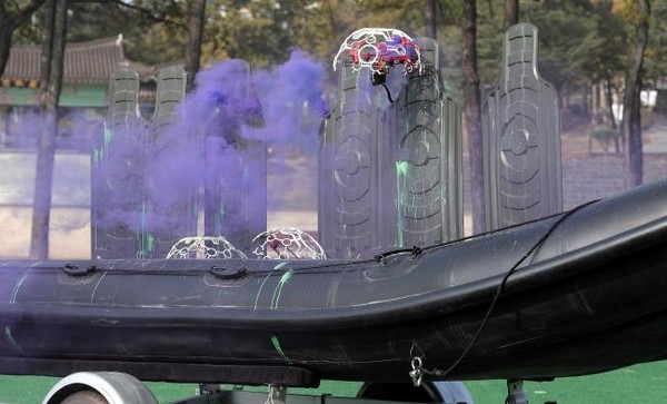 미식별 보트 옆으로 다가온 ‘경보 드론’이 스피커로 경고방송을 했다. 보트에서 별다른 반응이 없자 야간에도 선박을 추적할 수 있는 ‘서치(조명) 드론’이 주위를 맴돌며 위치를 확인하며 계속 감시했다. 선박에 폭발물을 투하하는 ‘폭탄 드론’, 소총 사격을 하는 ‘사격 드론’, 선박을 폭파하는 ‘자폭 드론’이 순서대로 출동하며 상황이 종결됐다.